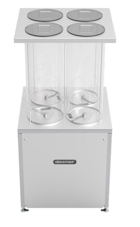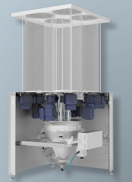 4 Zutatensilos mit je 110 l Fassungsvermögen und eingebautem Rührwerk sind in einem Gestell (1x1 m) untergebracht. Im Unterbau des Gehäuses befinden sich die Dosierschnecken und die Behälterwaage.