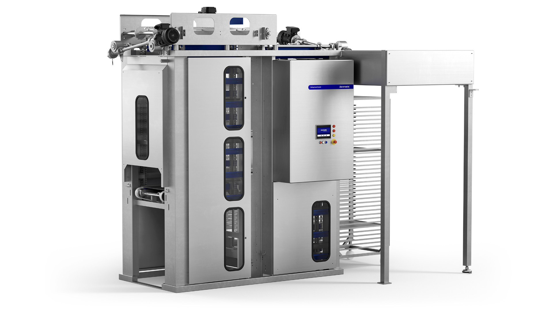 Das Backblechhandlingsystem von Danmatic ist ein vollautomatisches System für Backbleche, Dielen oder Kastenverbände. Das vollautomatische System kann mit einem Portionierer oder einem Entnahmesystem kombiniert werden.