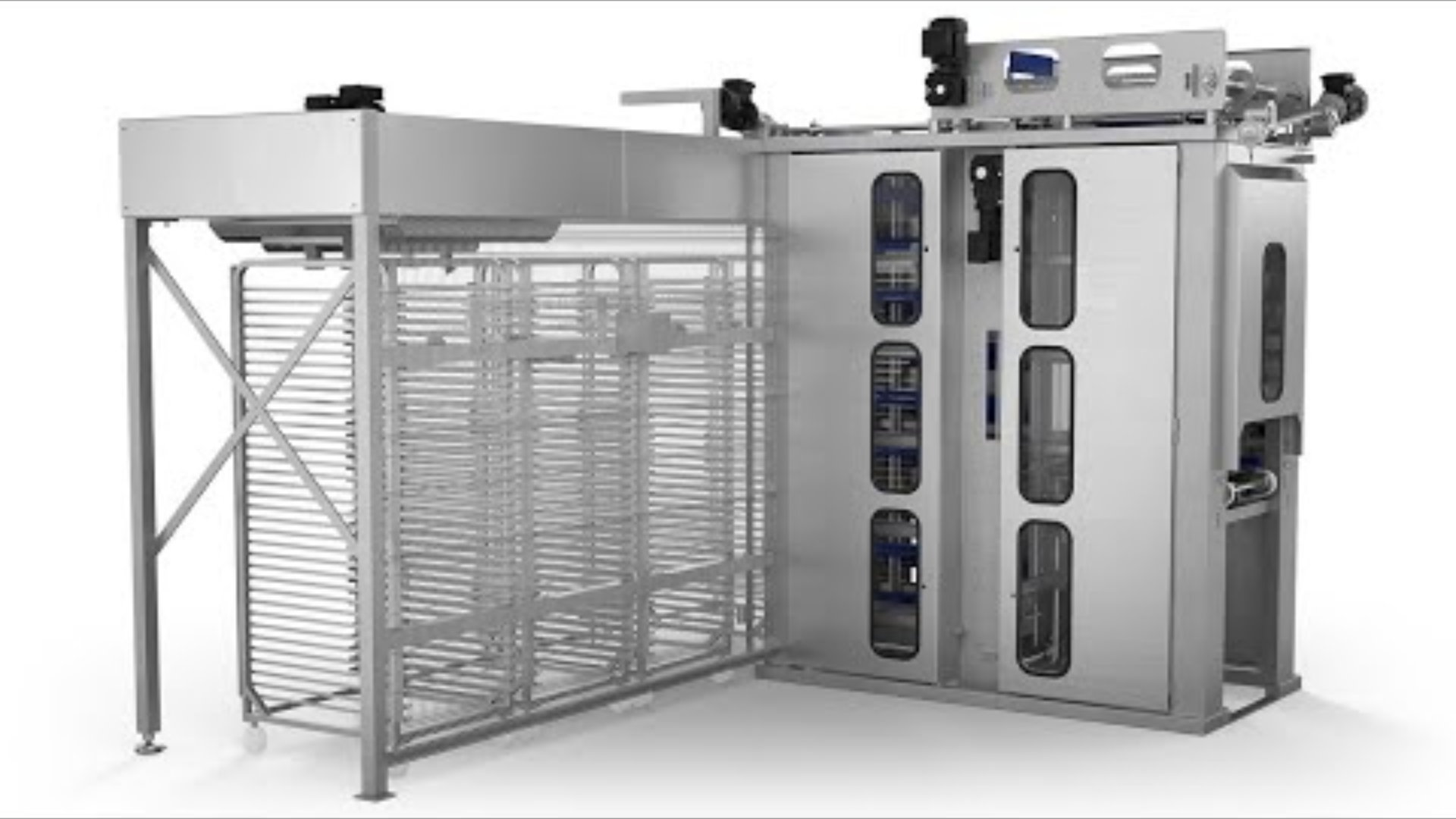 Das kompakte Danmatic Backblechhandlingsystem ist sehr platzsparend und besteht aus einem kombinierten Entlader/Belader und einem doppelstöckigen Bachblechförderer mit integrierter Hubeineinrichtung.