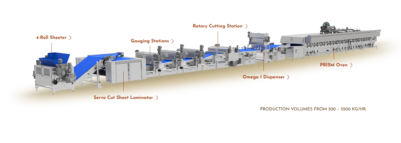 Formung: 2-, 3- und 4-Walzen-Ausrollmaschinen, Kalibrierstationen, Laminatoren, Rotationsschneidestationen, Omega-Topping-Spender