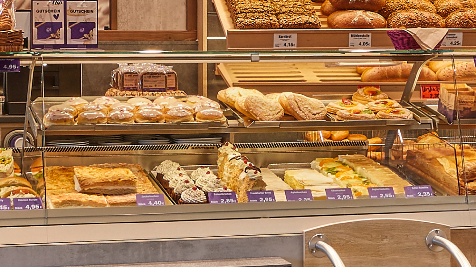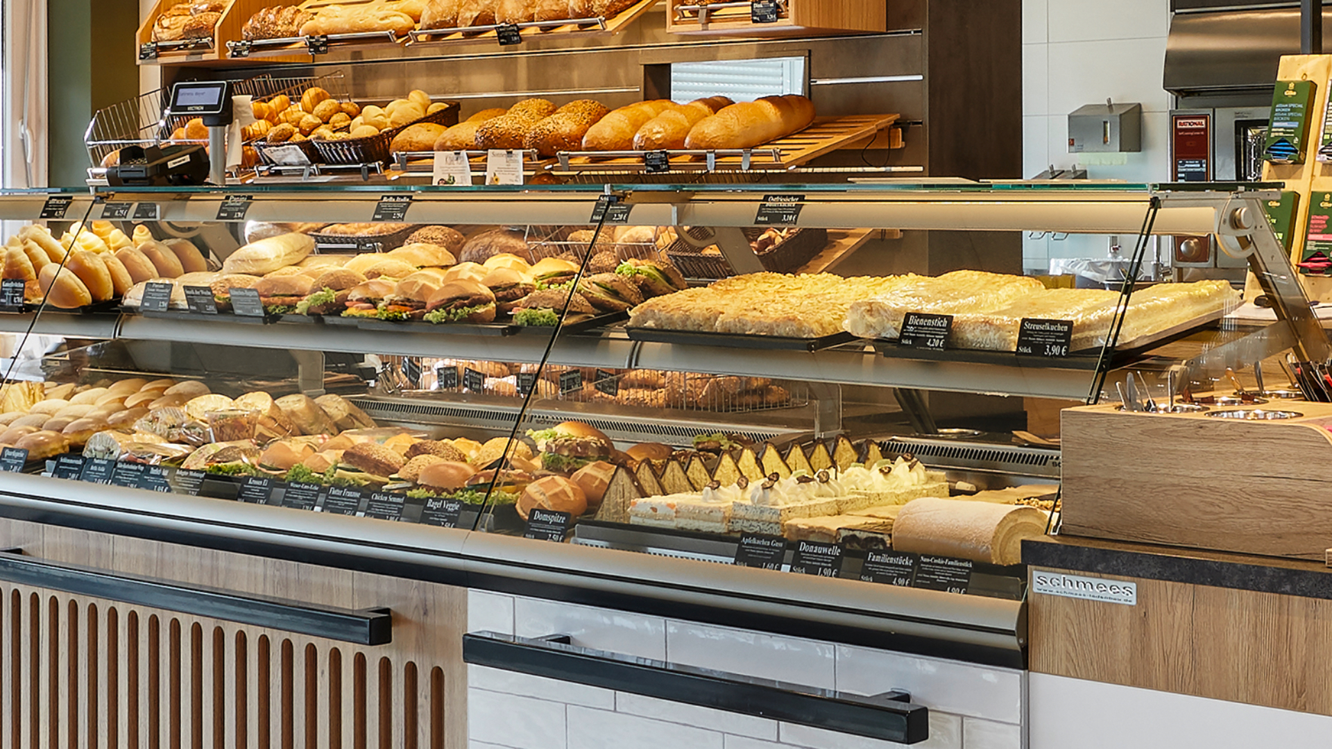 Das ausgefeilte Thekenkonzept von schmees Ladenbau kann dem tagesaktuellen Sortiment der Bäckerei angepasst werden.