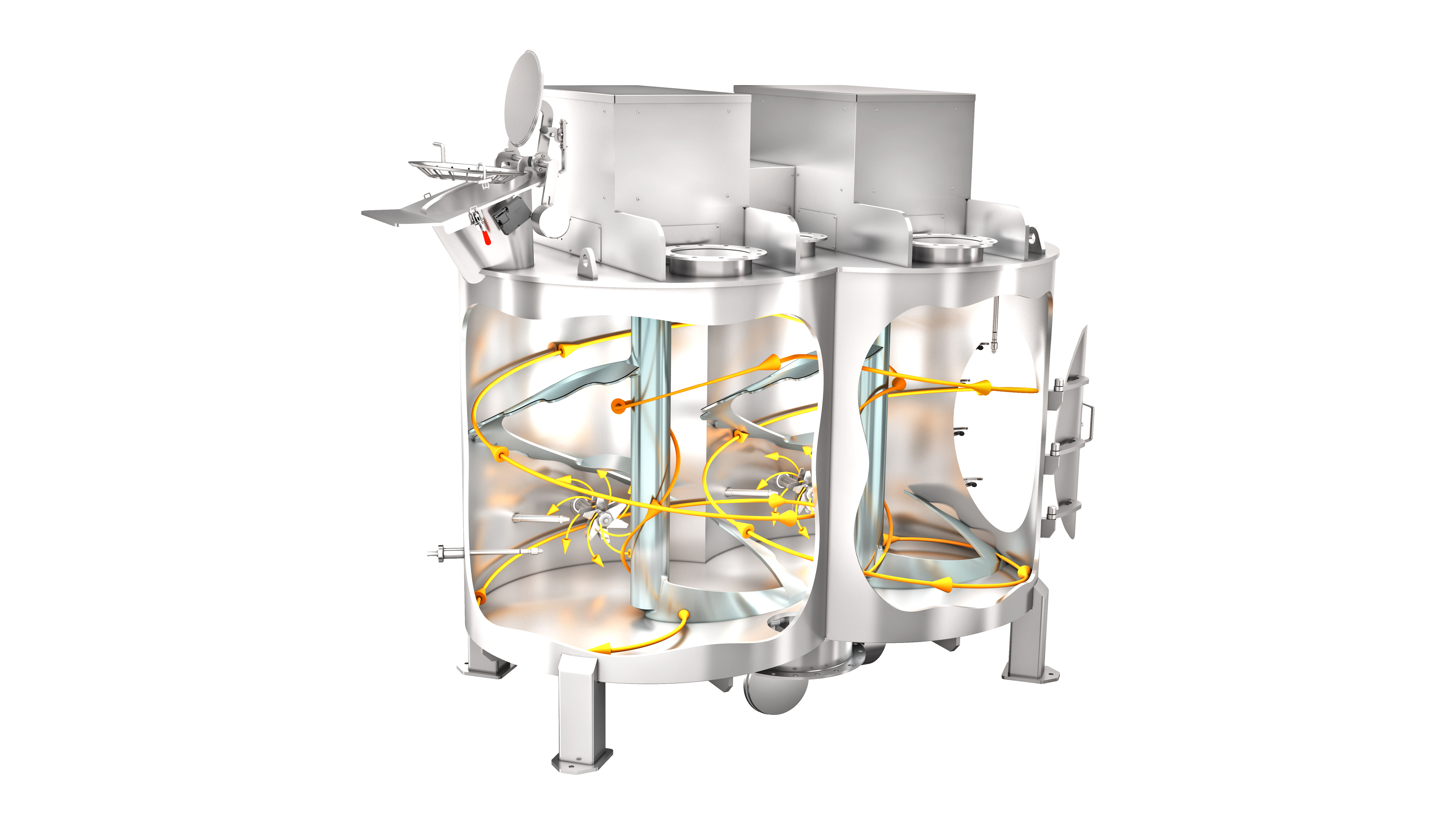 Die Arbeitsweise erschließt sich aus den helixartigen Mischwerkzeugen. Sie fördern die Güter in der Peripherie aufwärts und im Zentrum des Mischraumes abwärts. Es entsteht eine intensive Querverströmung des auf- und abwärts fließenden Produkts. Diese Art der Strömungserzeugung ist universell anwendbar für nahezu alle Produktkonsistenzen: trockenes, feuchtes oder nasses Pulver und sogar Pasten und Teigmassen. Dabei findet eine dreidimensionale Zufallsverteilung statt. Diese ist unabhängig vom Füllgrad, der Drehfrequenz und etwaig differierenden Komponenteneigenschaften wie Partikelgröße, Dichte, Kohäsion, Adhäsion oder Viskosität. Bei besonders fragilen Gütern oder staubexplosiven Zuständen kann die Mischwerksdrehfrequenz verringert werden: Der Mischvorgang findet ohne Qualitätseinbußen auch bei langsamer Drehbewegung der Mischwerkzeuge statt.