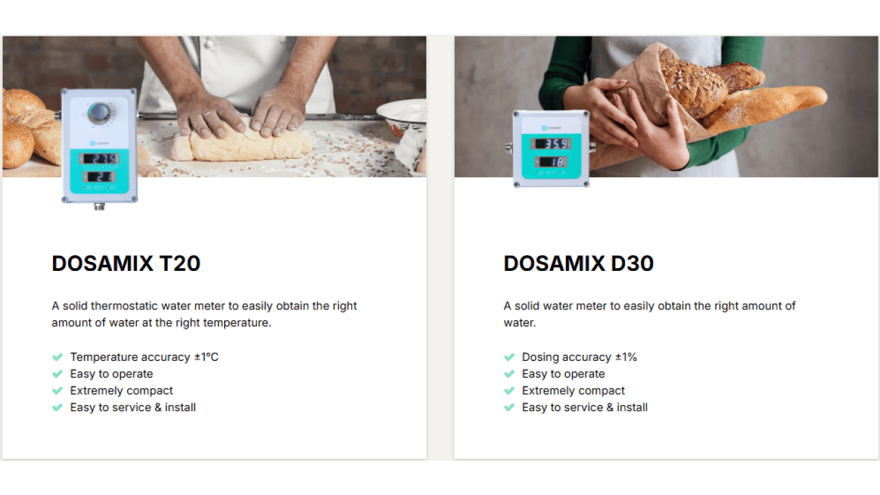 Dosamix wurde nach jahrelanger Branchenerfahrung gegründet. Bäckereien weltweit betonten den Bedarf an robusten und gleichzeitig erschwinglichen Wasserzählern. Dosamix entwickelte diesen Bedarf und entwickelte den Dosamix T20, einen robusten thermostatischen Wasserzähler mit einer Temperatur- und Dosiergenauigkeit von ± 1 %, sowie den Dosamix D30 mit einer Dosiergenauigkeit von ± 1 %. Beide Dosamix-Geräte sind einfach zu installieren, zu warten und zu bedienen, selbst in kompakten Bereichen mit begrenztem Platzangebot.