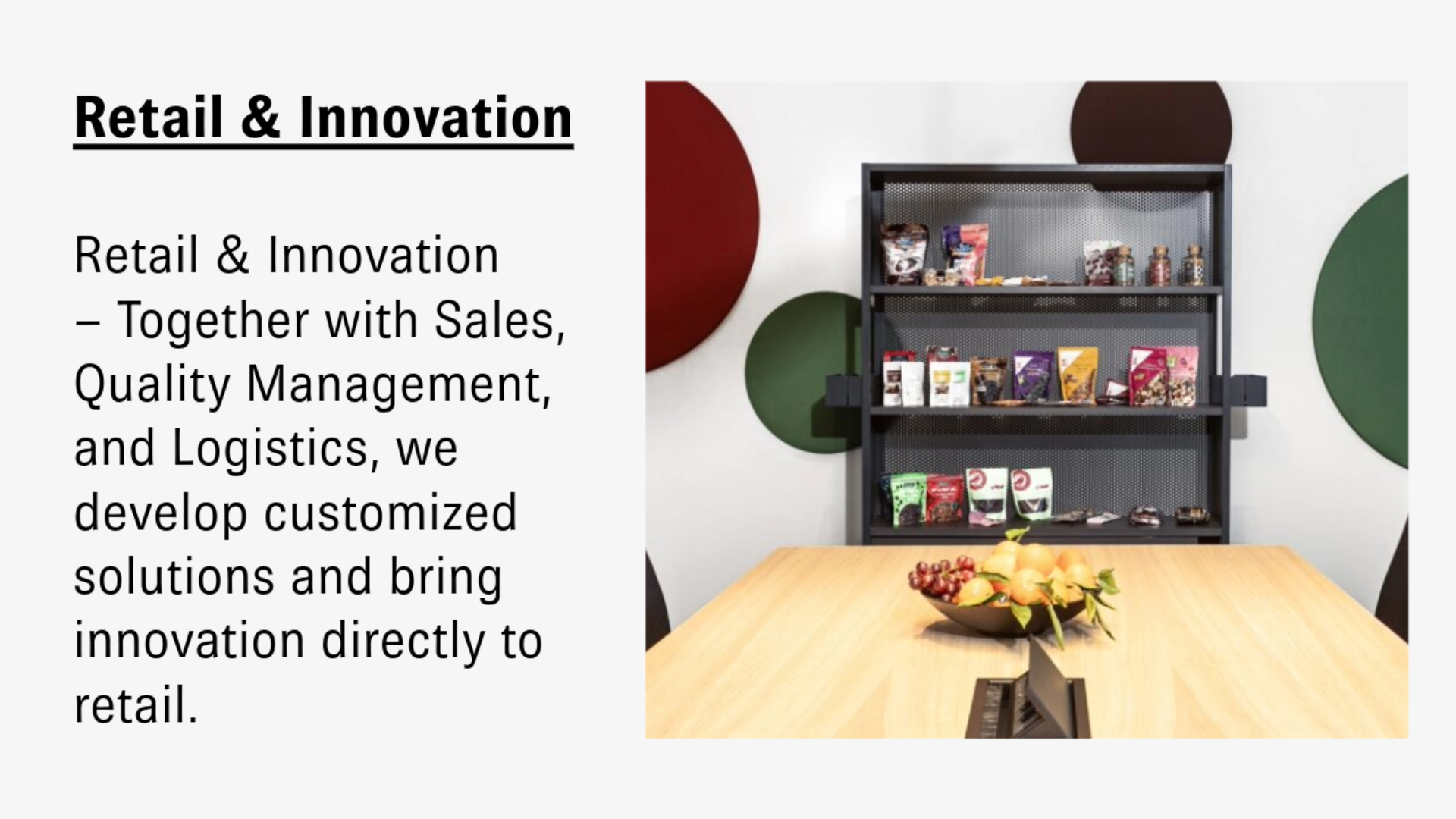 Unser Retail & Innovation Team steuert komplexe Einzelhandels- und Projektlösungen – von der Verpackung bis zur Produktion. Mit umfassender Marktanalyse und enger Zusammenarbeit mit Dienstleistern für Verpackung, Mischung und Veredelung entwickeln wir Sortimentsstrategien und treiben Innovationen für Ihren Markterfolg voran.