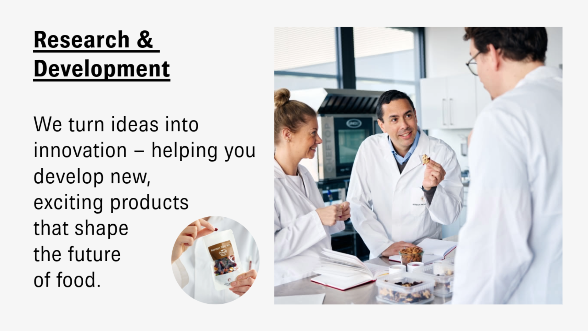 Im Food Harbour Hamburg bündeln wir Innovationskraft und Praxiserfahrung: Von Ideenfindung über Prototypenentwicklung bis hin zu Go-to-Market-Strategien unterstützen wir Sie bei der schnellen und erfolgreichen Umsetzung neuer Produktideen. Ideal ergänzt durch unser umfassendes R&D-Angebot.