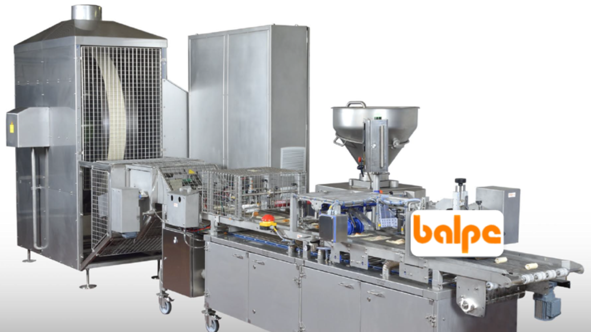 Diese Balpe-Linie besteht aus einem Backzylinder (Gas- oder Elektroheizung), eine Füllungsdosierung und einer falten & rollen Vorrichtung. Die Produktionskapazität kann je nach Rezeptur und Falzart zwischen 1.500 und 6.000 Produkten pro Stunde liegen.