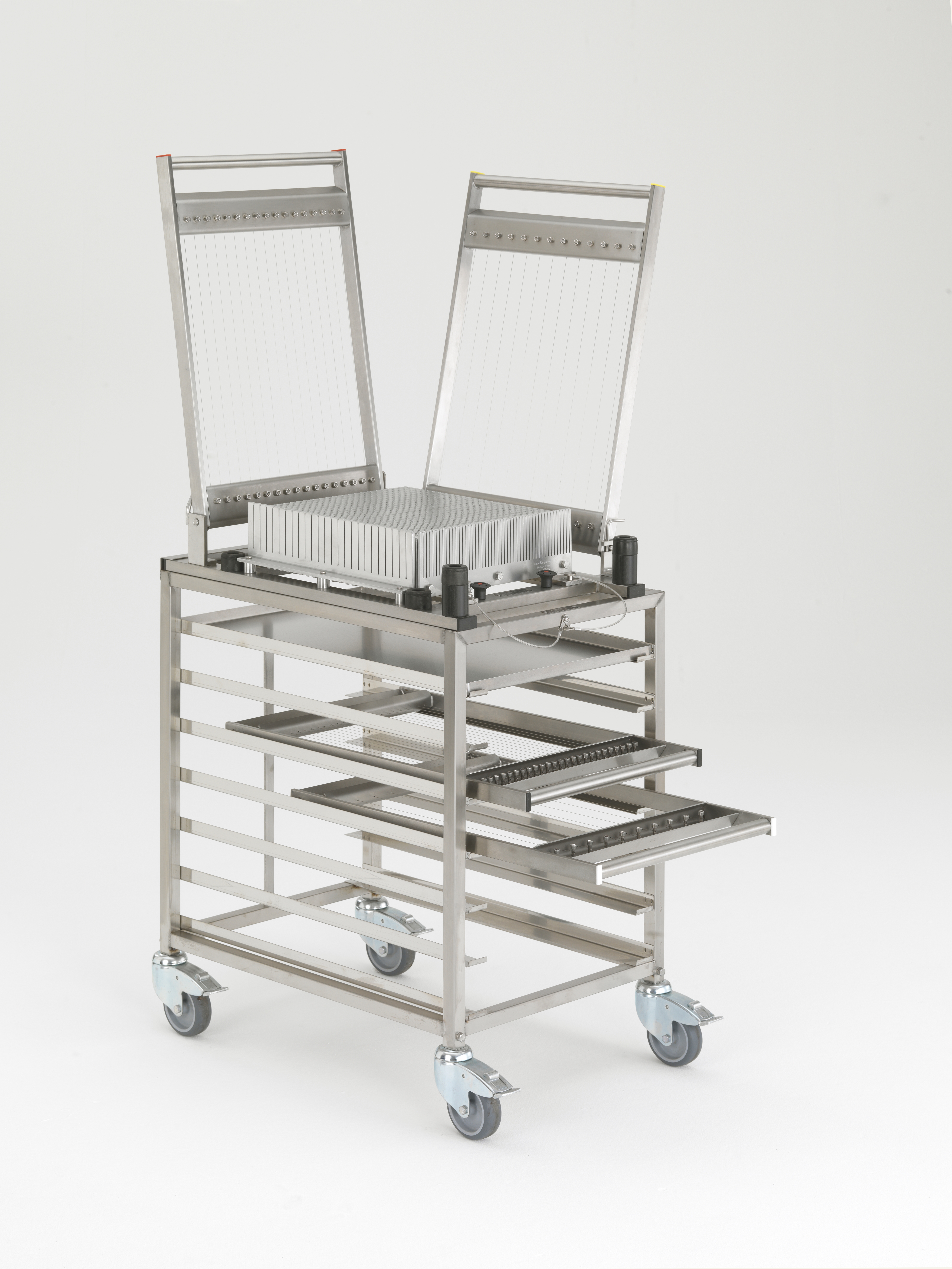 Der Dedy Doppelschneider ist wie der Dedy Pralinenschneider ideal zum exakten Schneiden von verschiedenen Massen geeignet. Der Unterschied zum Dedy Pralinenschneider besteht darin, dass das der Doppelschneider das Drehen der geschnittenen Masse zwischen Quer- und Längsschnitt entbehrlich macht und damit den Arbeitsgang optimiert. Der Auflageblock (Basis) besteht aus eloxiertem Aluminium, alle weiteren Teile sind aus Edelstahl hergestellt. Die Rahmen sind auch hier sehr leicht zu wechseln und zu reinigen.