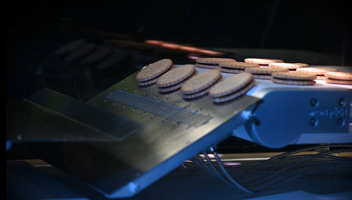 Unser N1 Scanner erfasst die 3D-Form und die Farbe vom Produkt auf dem Förderband, berechnet Höhe, Volumen, Gewicht, Durchmesser, Belagfarbe und vieles mehr, und sortiert die defekten Produkte aus.