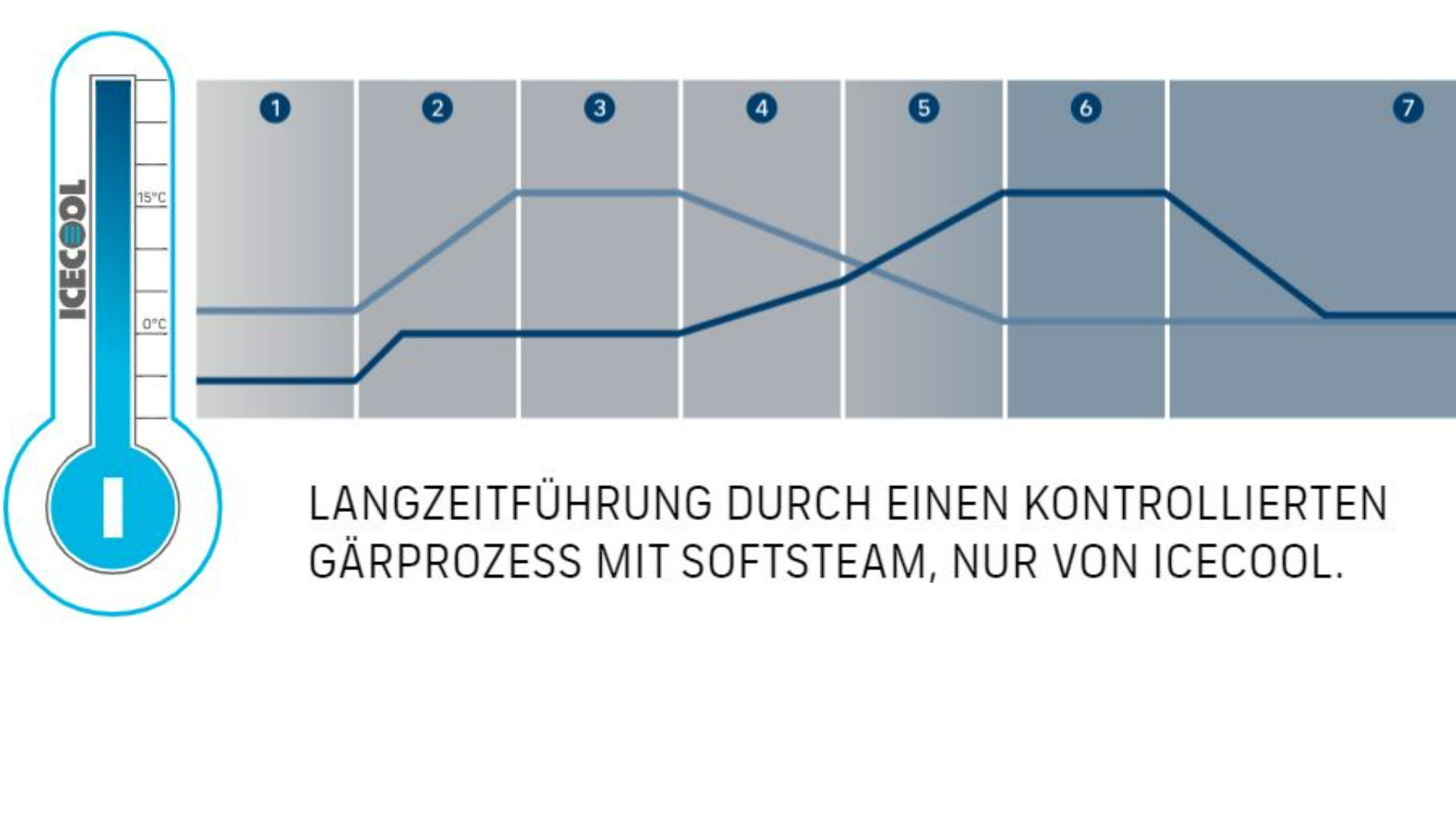 Langzeitführung durch einen kontrollierten Gärprozess mit SOFTSTEAM, nur von ICECOOL. Durch schonende Verdunstung entsteht ein ideales Befeuchtungssystem für die Teiglinge, das zusätzlich die Umwelt schont.