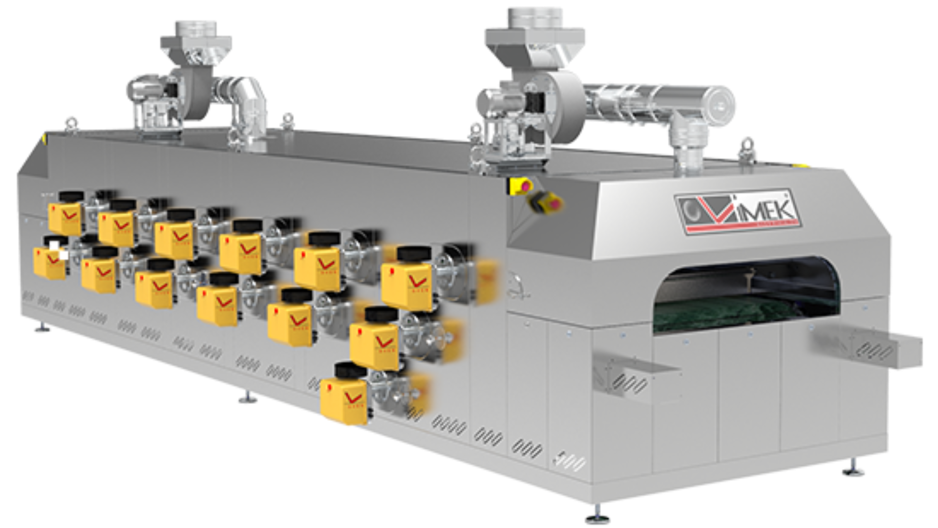 Vimek Tunnelöfen sind die richtige Lösung für das Backen bei hohen Temperaturen der Produkte, die für diesen speziellen Prozess benötigt werden. Entwickelt mit unabhängigen Kammern, um die Temperatur während der verschiedenen Backphasen des Produkts zu regulieren und eine Backtemperatur von bis zu 500 °C zu erreichen.
