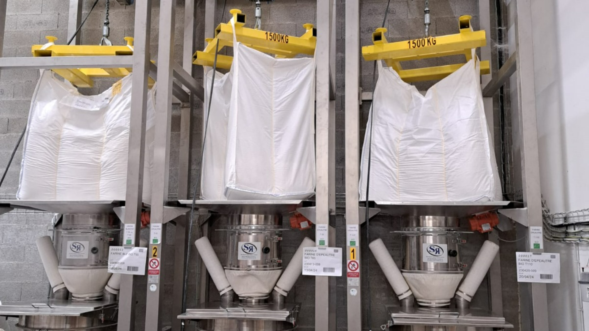 Station made entirely of stainless steel for emptying large bags of powder product, for which there is no bulk delivery by the supplier of the raw materials.