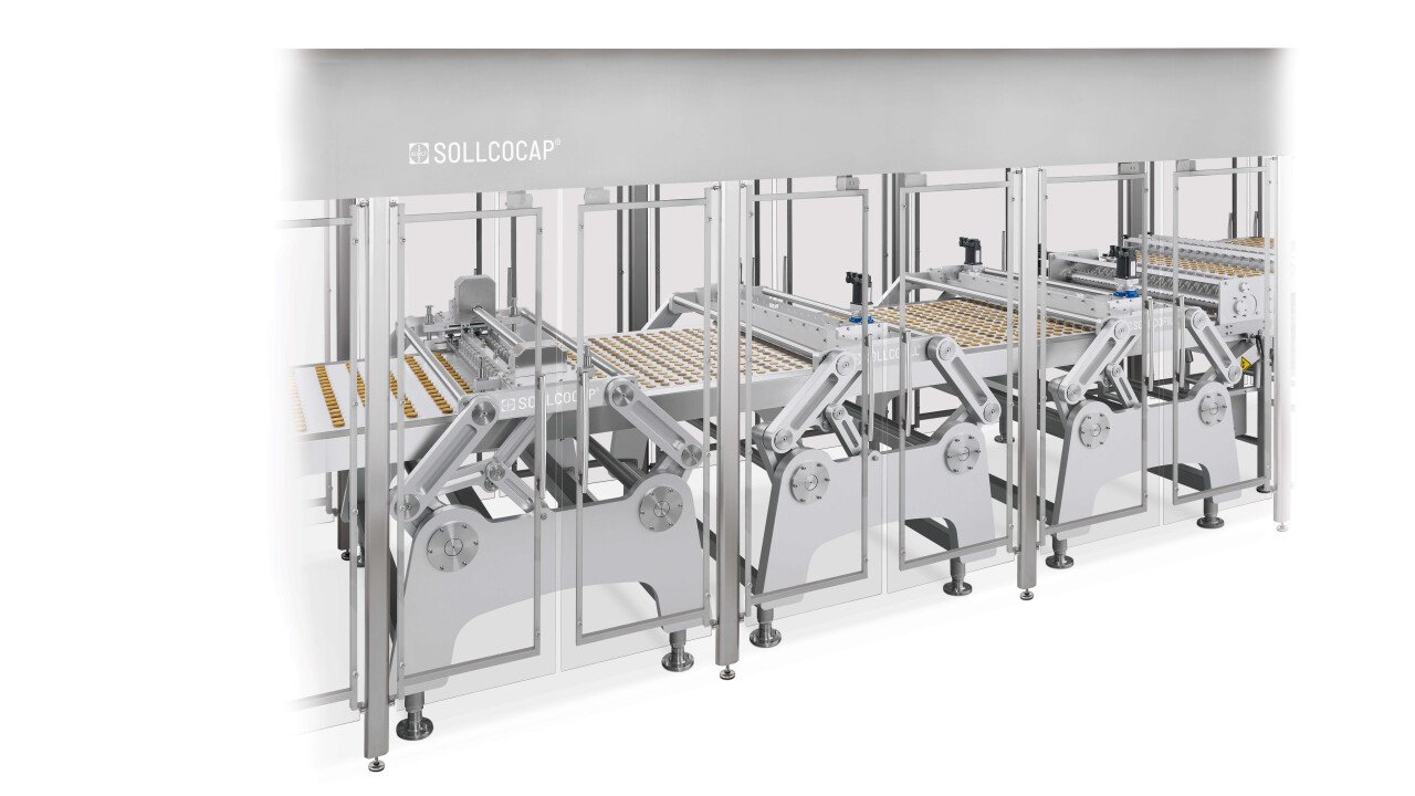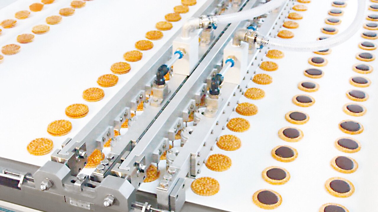 Sollcocap is a system consisting of alignment and turnover device, depositing system and sandwiching unit. Depending on the output requirement, every second row of biscuits or double rows of biscuits can be turned before the depositing process. The volumetric dosing of the Sollcocap enables precise depositing of all fat and sugar masses with and without ingredients. Specially developed suction nozzles with low air consumption position the sandwich cover exactly on the deposited base biscuit. The automatic rejection of defective products is made possible by the optical quality control.