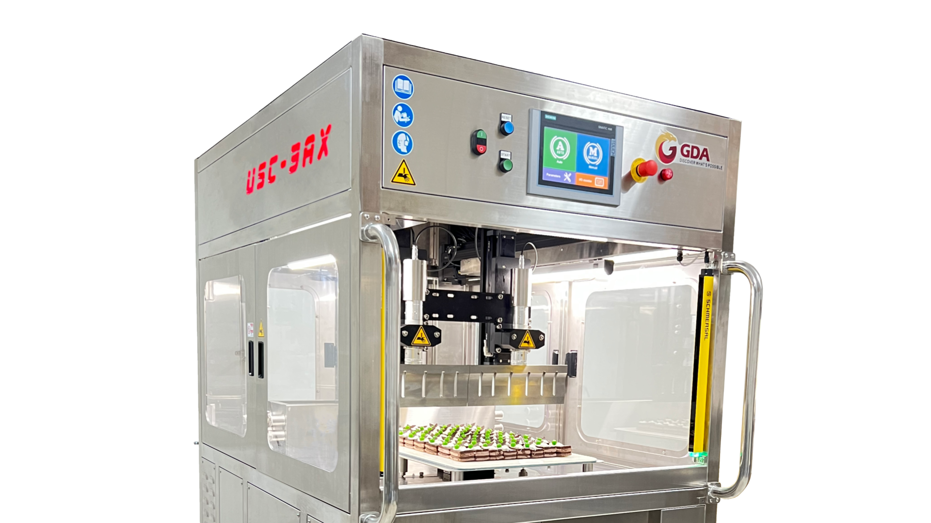 The USC-3AX by GDA Automation is an advanced ultrasonic food slicer, ideal for small to medium bakery and confectionery factories. It efficiently portions round, sheet, and roll products, whether fresh or frozen, into precise slices. Ultrasonic technology ensures clean, smooth cuts without applying extra downward force, preserving product structure and quality. Compared to traditional cutting machines, routine maintenance time is reduced by 70–90%. The blade operates on Cleanroom-class linear guides, meeting hygienic standards and preventing dust contamination. Enhance your bakery’s efficiency and product presentation with the USC-3AX.