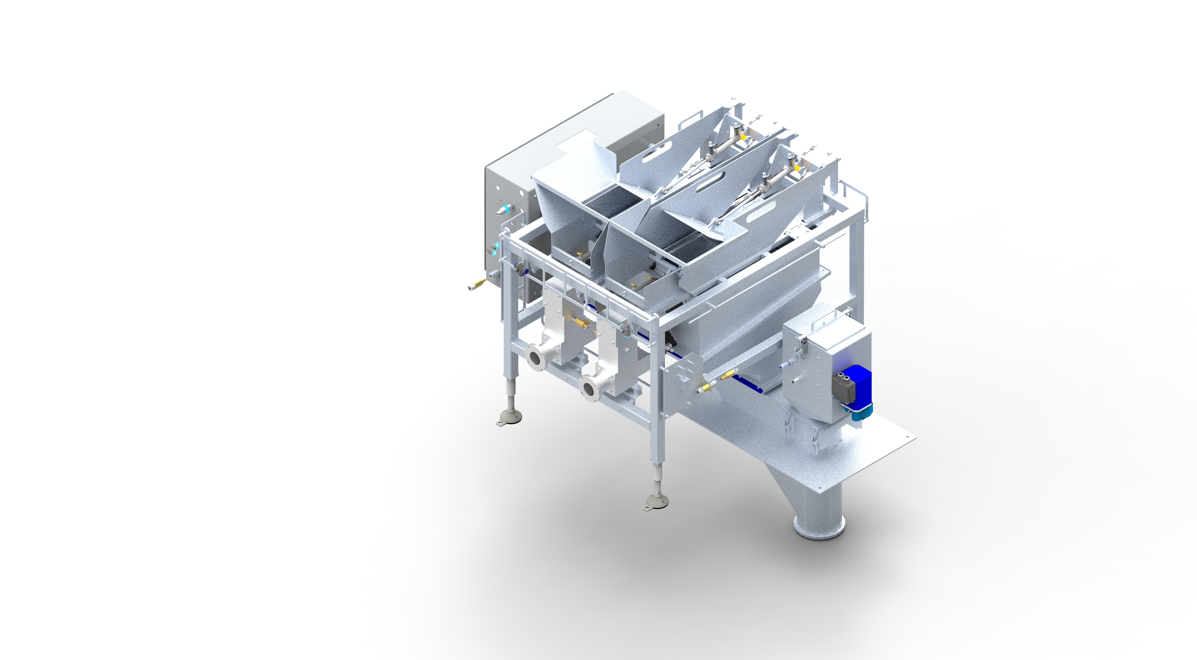 The counting machine discharges the formed batch into the chamber, which is then closed almost airtight. In the chamber, oxygen is extracted from the products using a vacuum. The chamber is then flushed with CO2 and the products are discharged through a hopper into the format tube of our VFFS AVN E350 SCD (all under CO2 environment). In our VFFS AVN E350 SCD, which has been optimized for MAP packaging, the bags are sealed airtight.