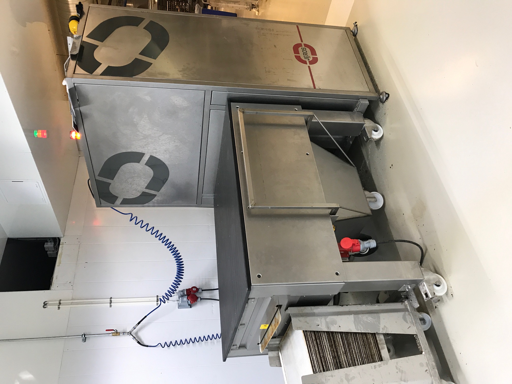Die komplette Beschickungstechnik ist in einem geschlossenen Edelstahlgehäuse, das fest mit dem Boden verdübelt ist.