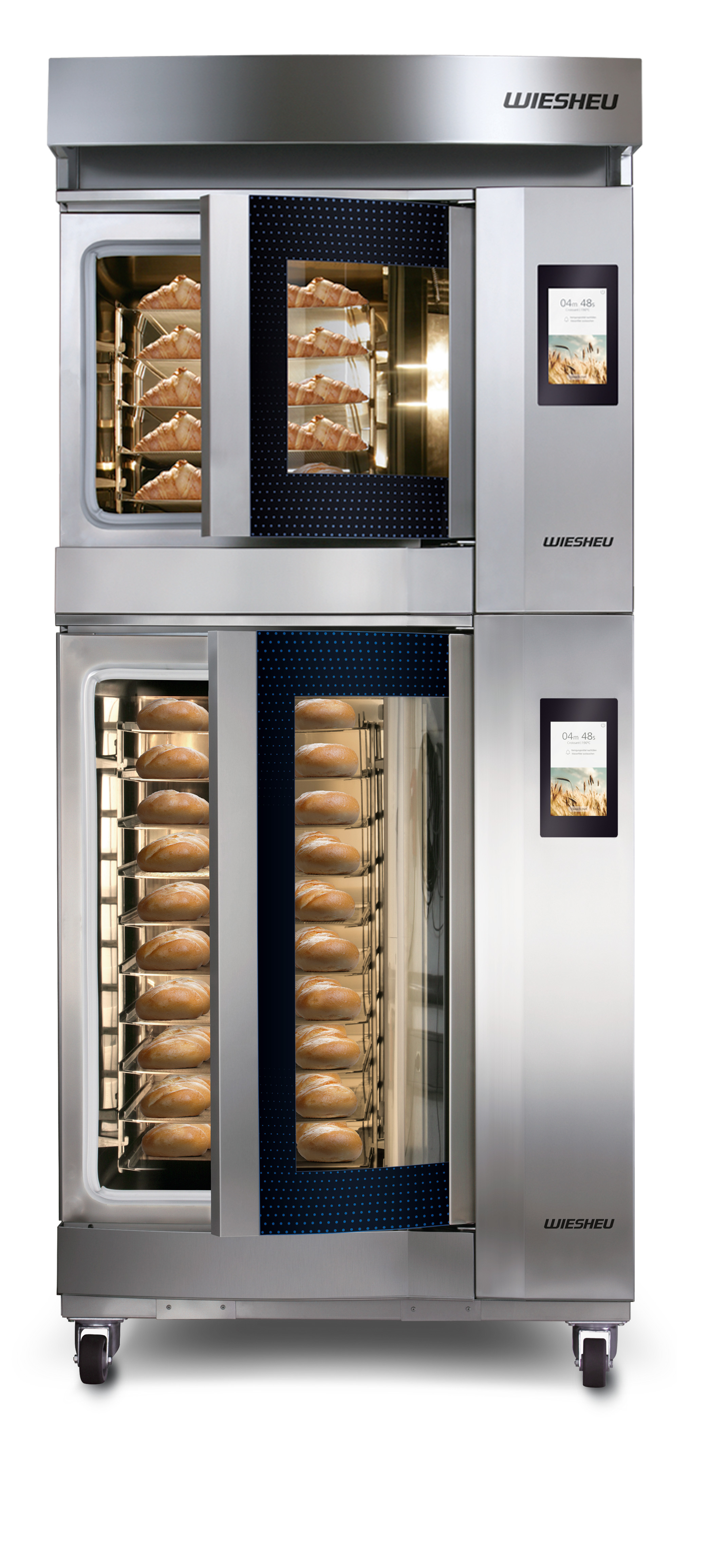 Mit dem neuen Dibas blue2 präsentiert WIESHEU auch erstmals das sensorgesteuerte Beschwadungssystem ActiveSteam®. Die Technologie verbindet dabei die Vorteile der bislang angebotenen Varianten Rohr- und Kaskadenbeschwadung bei Aufheizzeit, Backergebnis und Energieverbrauch. Das Beschwadungssystem ActiveSteam® reduziert gegenüber einer Kaskadenbeschwadung die Aufheizzeit um etwa 10 Minuten. Damit kann der Backprozess bei Bedarf deutlich schneller gestartet werden und im Stand-by-Modus ist zudem die Backtemperatur schneller erreicht. Das System verknüpft neueste Lüfter- und Sensortechnologie mit langjährigem Expertenwissen zur Luftströmung und Dampferzeugung. Die schnelle Erzeugung von sattem Dampf ermöglicht eine effektivere Wärmeübertragung auf die Backwaren. Dadurch wird die Backzeit verkürzt und der Energieverbrauch reduziert. Das Ergebnis: gleichmäßig gebackene Waren mit sichtbarem Glanz.