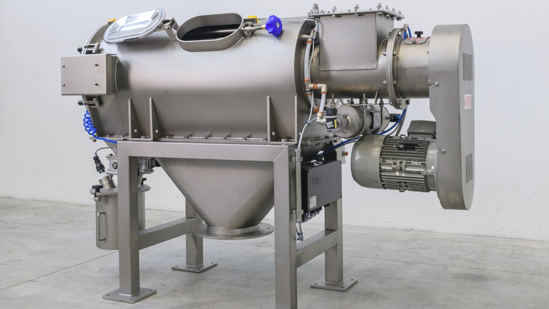 The product, fed by a metering or pneumatic conveying element, is introduced into the tumbler trough an auger which regulates the flow towards the sieving chamber. A rotating shaft creates a centric force that spreads the product around the walls of the cylindric sieve.