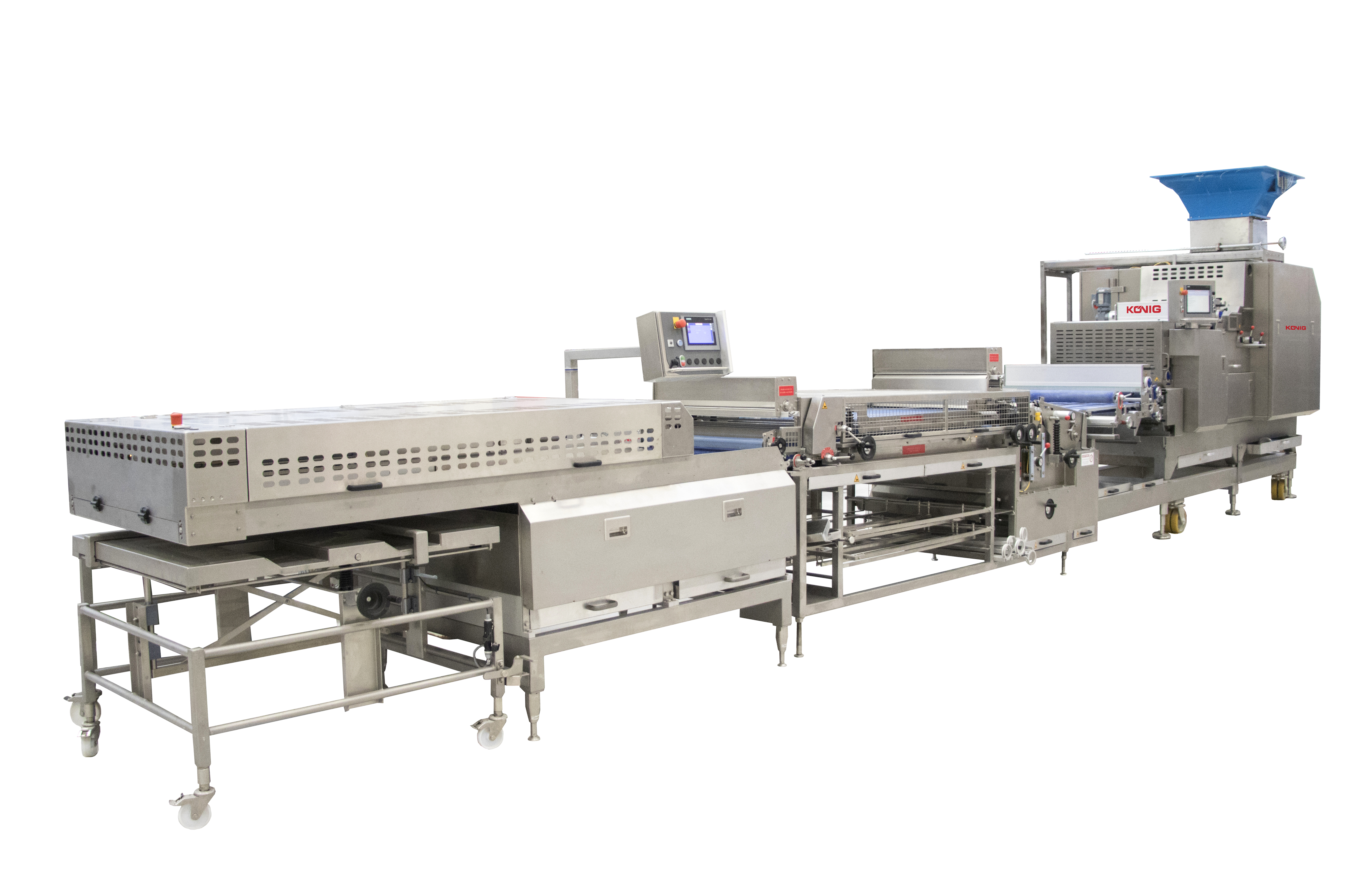The industrial version of the Koenig multipurpose line features higher performance at the same high product quality. From dough dividing up to retracting, the entire line is dedicated to increased strokes per minute in a stable design. This enables a capacity of up to 30,000 pieces per hour. Aside from the make-up line, Koenig also offers subsequent modules, such as tray proofer and tunnel oven for your automated, low-maintenance and centrally controlled production line from one supplier.