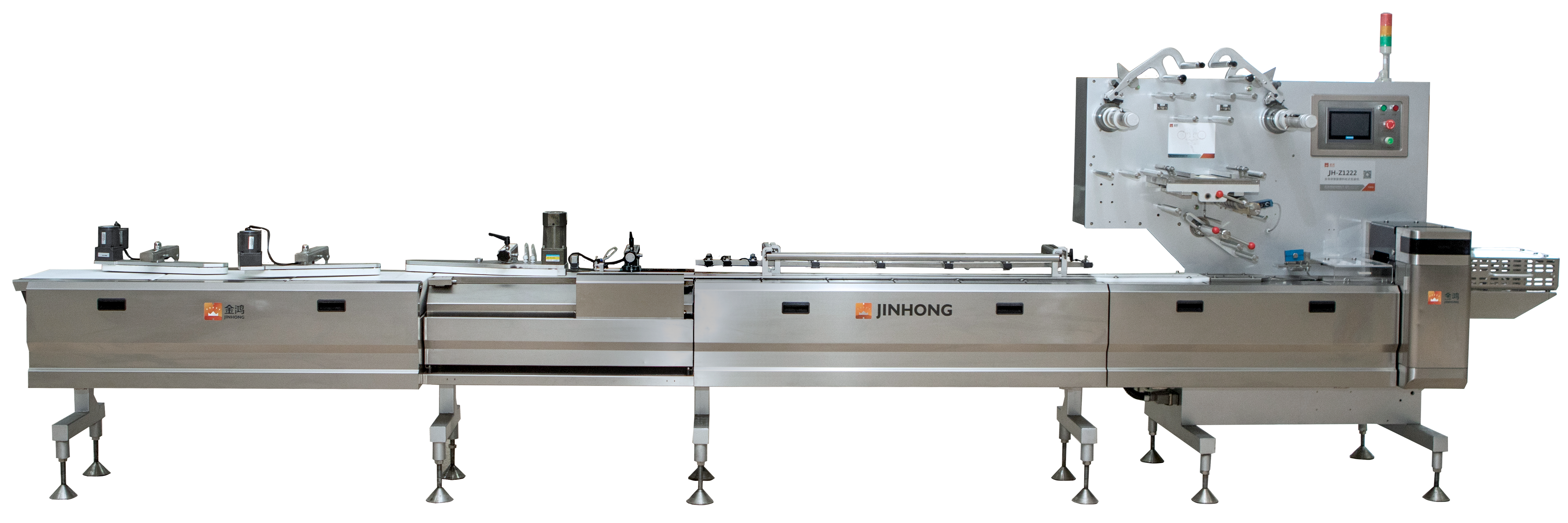 JINHONG JH-Z1222: This machine is equiped with 10 servo EtherCAT bus control electric system,can pack different kinds of bars,chocolate, wafer,cakes bread, biscuit and some other coating, crispy or sticky products etc.
